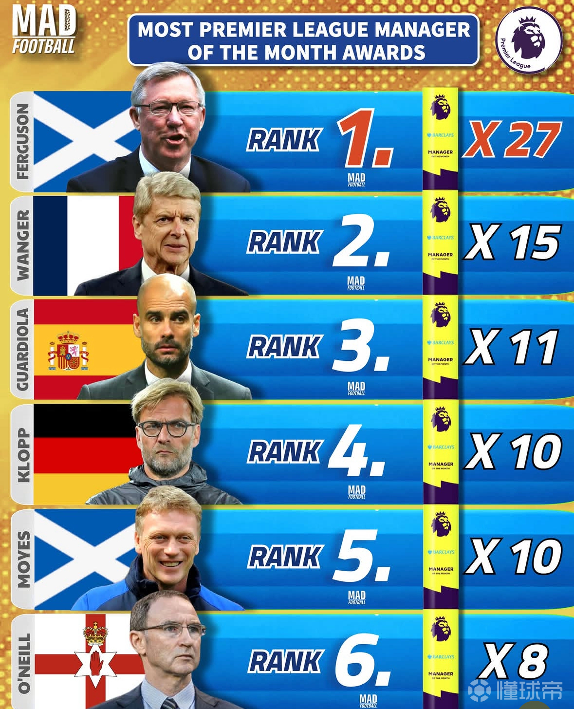英超历史上获得过最多月度最佳主教练的排行榜
