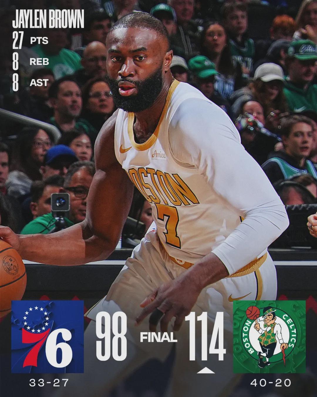 凯尔特人这边,杰伦-布朗投篮17中9,三分6中2,罚球7中7,得到27分8篮板8助攻5失误。凯尔特人首发中锋科塔爆发了:出战27分钟,投篮14中10,罚球10中7,砍下27分17篮板2助攻1抢断3盖帽,正负值+20全场第二高。