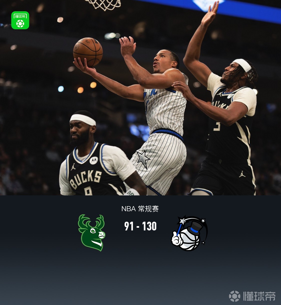 第四节雄鹿小特伦特拿下5分,魔术贾马尔-凯恩拿下8分,最终雄鹿91-130不敌魔术