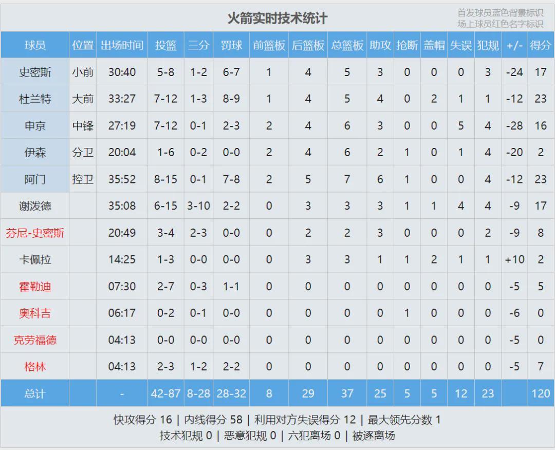 最近16场比赛,马刺15胜1负!此役马刺四人得分20+,全队三分40中21!文班亚马29分8板2断4帽、卡斯尔23分3板5助、福克斯20分10助、凯尔登20分2助、哈珀19分6助。火箭这边,阿门23分7板6助、杜兰特23分5板4助2帽。