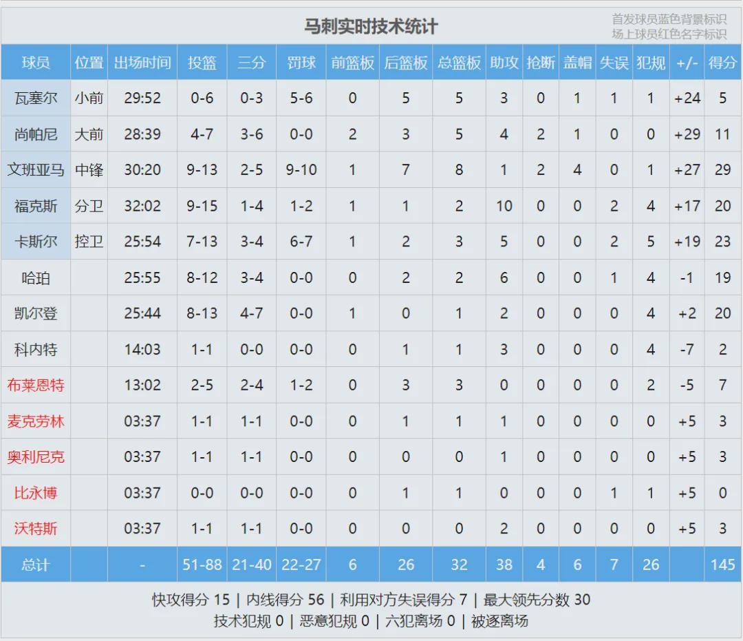 马刺最多领先到27分,尽管火箭追回一些分数,但分差依然在15+!三节打完,马刺110-94领先火箭16分。第四节火箭一度缩小到12分,凯尔登和文班连砍5分,比赛很快进入垃圾时间。全场结束,马刺145-120大胜火箭25分。