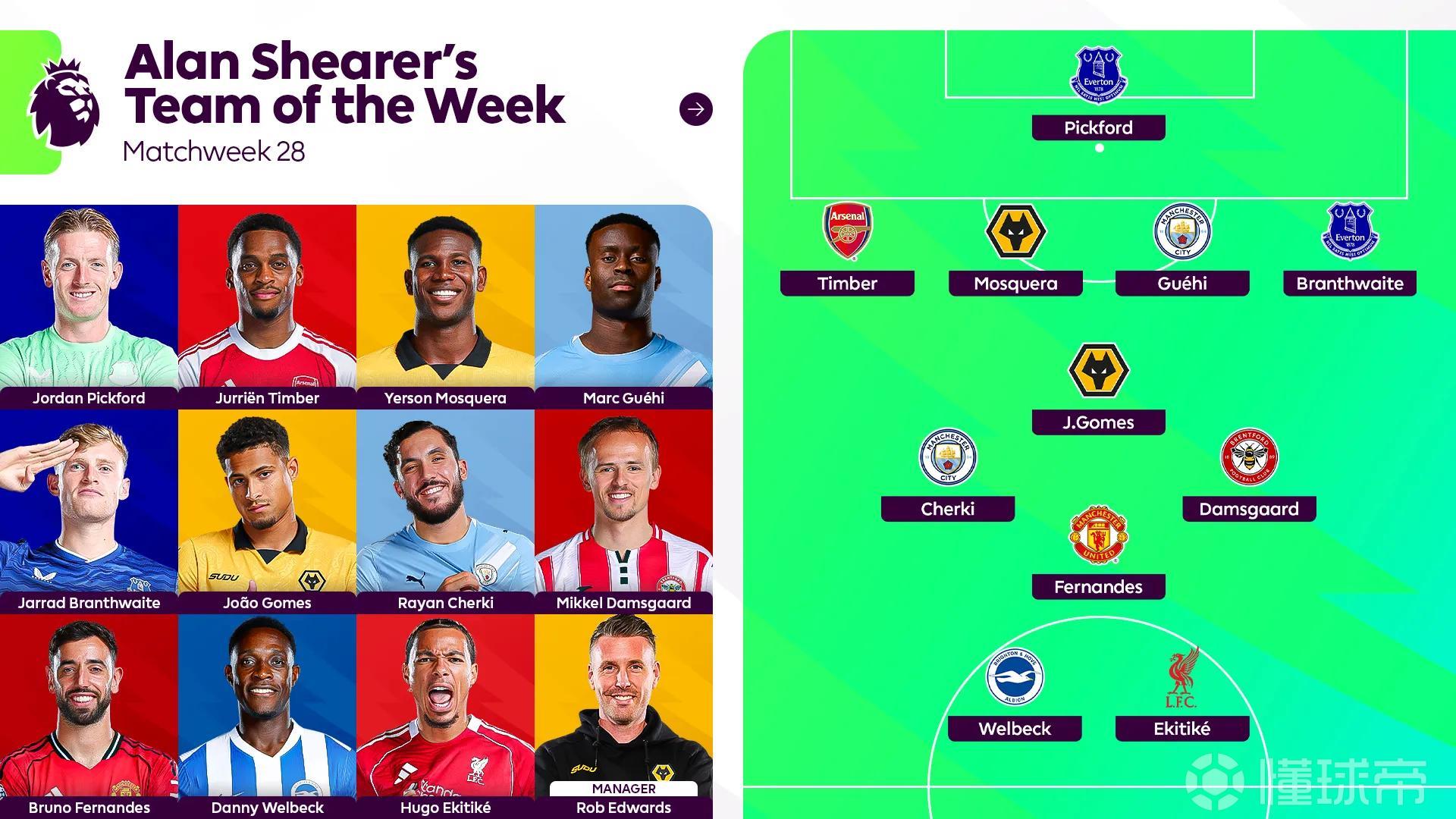 希勒评英超第28轮最佳阵容:埃基蒂克、B费、廷贝尔在列