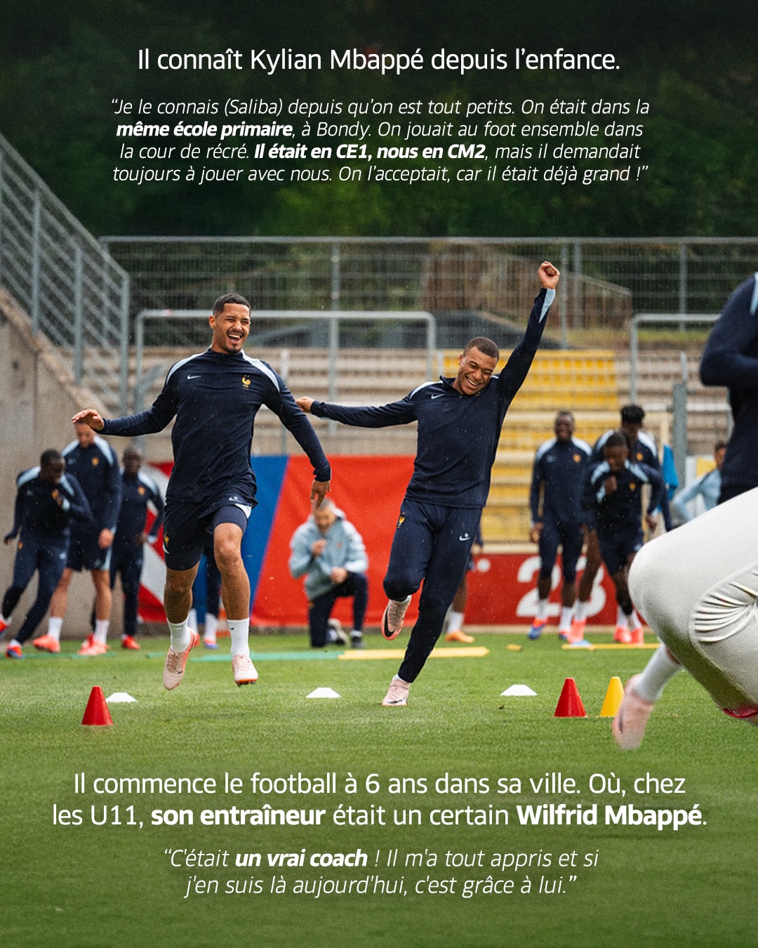 “我和萨利巴很小就认识了,我们在邦迪的同一所小学上学,我比他高两三个年级,但他个子很高,所以他一直很喜欢和我们一起踢球,我们也接受了!”姆巴佩如是说。