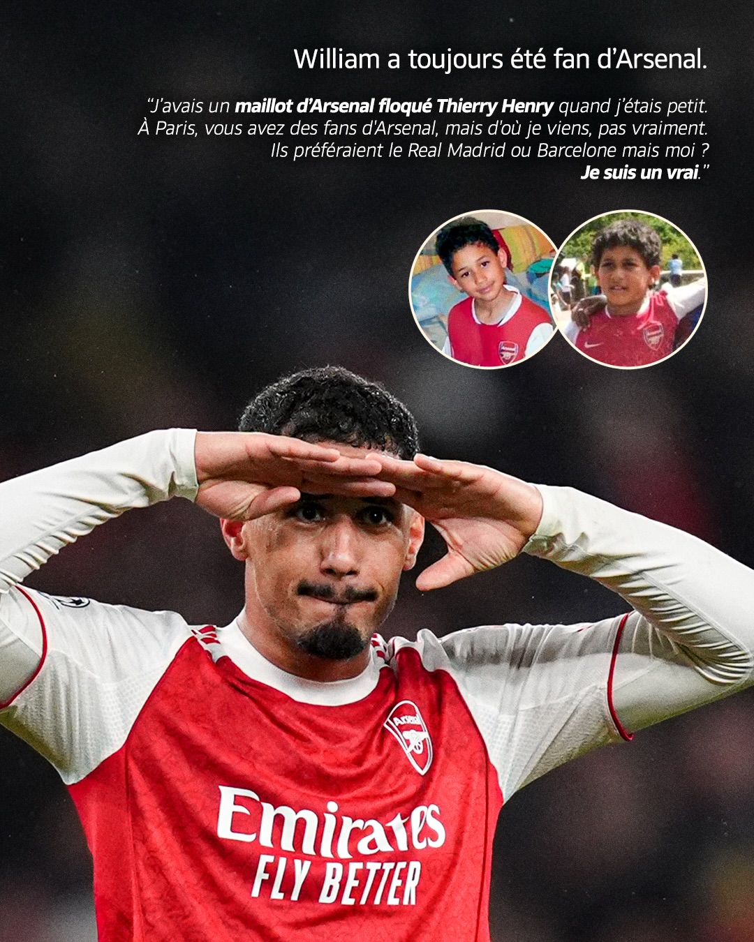 萨利巴从小就是阿森纳球迷——“我小时候的第一件球衣就是印着蒂埃里-亨利名字的阿森纳球衣。在巴黎,阿森纳球迷其实很多,但在邦迪郊区较少。他们更喜欢皇马巴萨,但我是真正的枪手球迷,从小如此。”