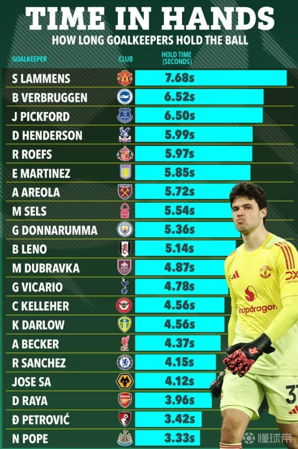 本赛季,英超采用了新规则,门将被禁止双手持球超过8秒钟,否则会判给对手角球,而根据统计,拉门斯的平均持球时间比联赛中任何其他守门员都要长,但仍在8秒以内——他每次捡球或接球时平均持球时间为7.68秒,仅比限制少0.32秒。