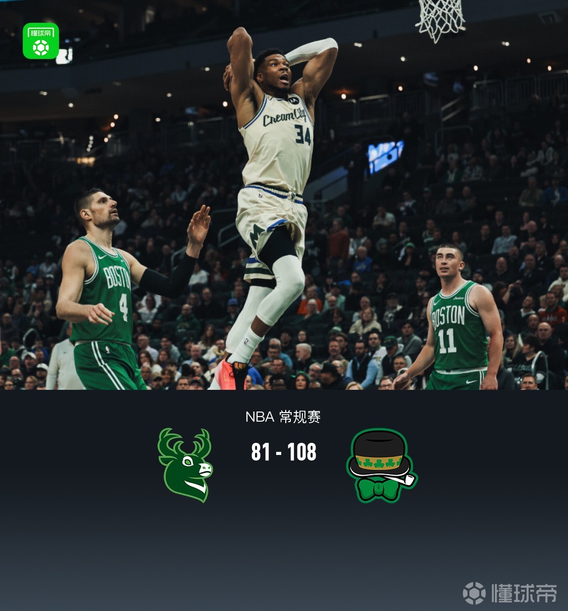 凯尔特人108-81大胜雄鹿,普里查德25分,字母哥复出取19+11